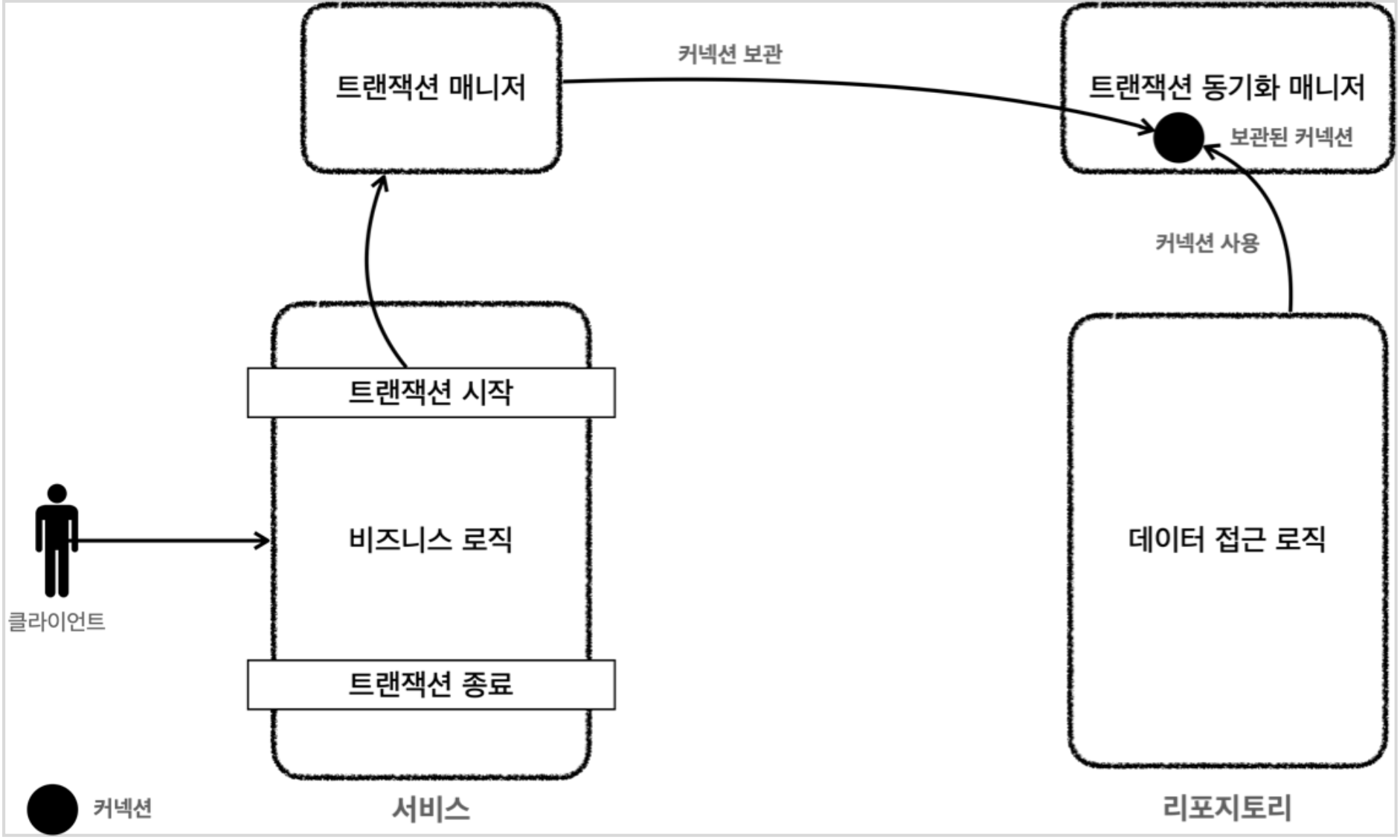 - 트랜잭션이 시작되면 트랜잭션 매니저는 커넥션을 생성하고 해당 커넥션을 동기화매니저(TransactionSynchronizationManager)에 보관한다.