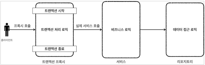 - 트랜잭션 프록시가 트랜잭션 처리로직을 가져간다.
