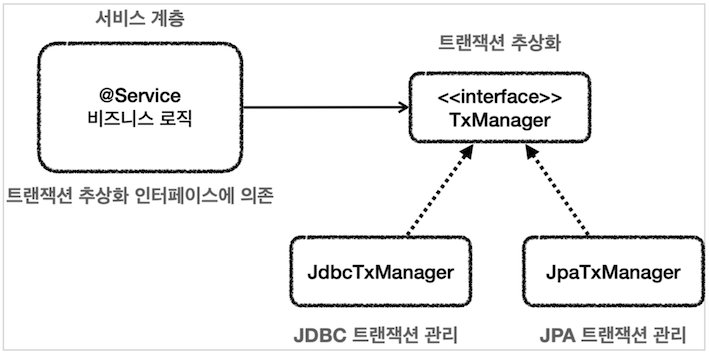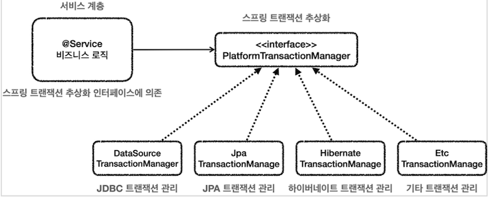 - 이 방법을 해결하기 위해 서비스가 의존하는 대상을 트랜잭션의 추상화(인터페이스)에만 의존하게 만든다.