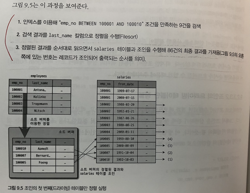 - 일반적으로 조인이 수행되고 나면 레코드 수가 꽤나 증가한다. 따라서 조인을 실행하기 전에 첫 번째 테이블의 레코드를 먼저 정렬한 다음 조인을 실행하는 것이 정렬의 차선책이다.