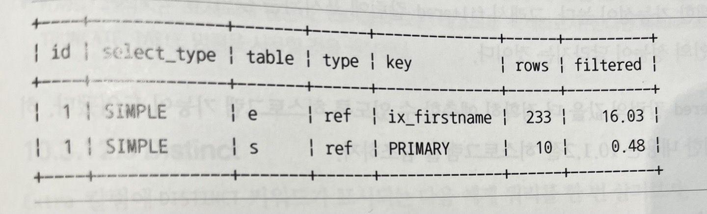 - 특히나 조인을 사용할 때 일치하는 레코드 수가 적은 테이블이 드라이빙 테이블로 선정되어야 하는데 이 때 rows 칼럼 * filtered 칼럼 의 결과로 비교한다.