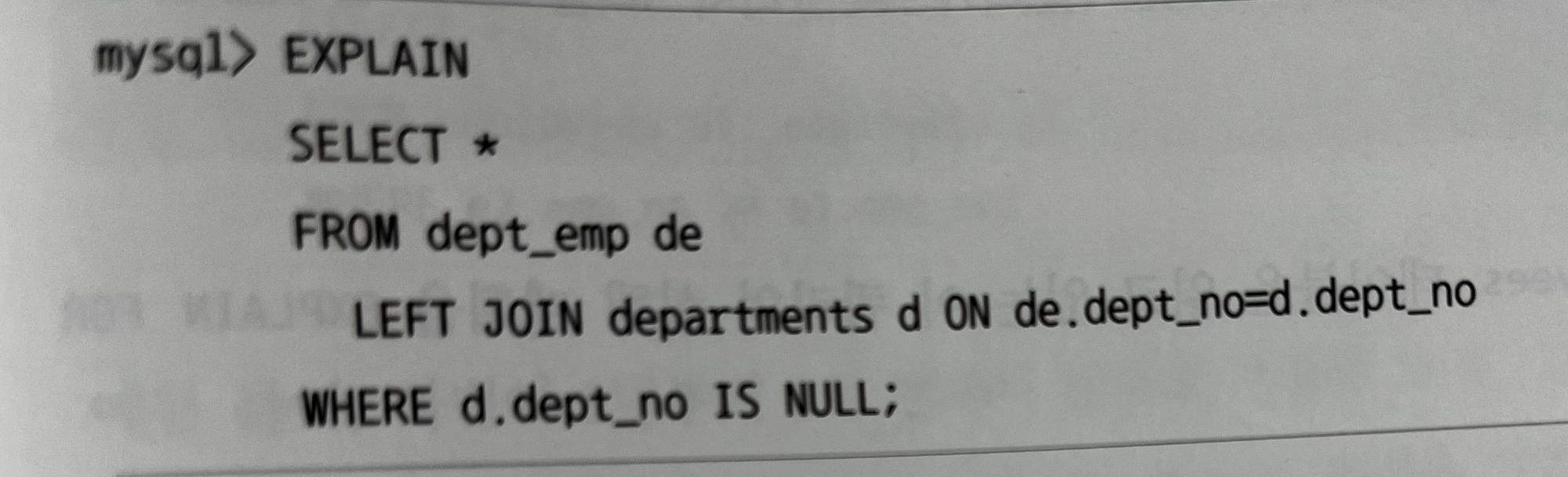 - 아우터 조인을 이용해서 안티 조인을 수행하는 쿼리에서 Not exists 메시지가 표시된다.