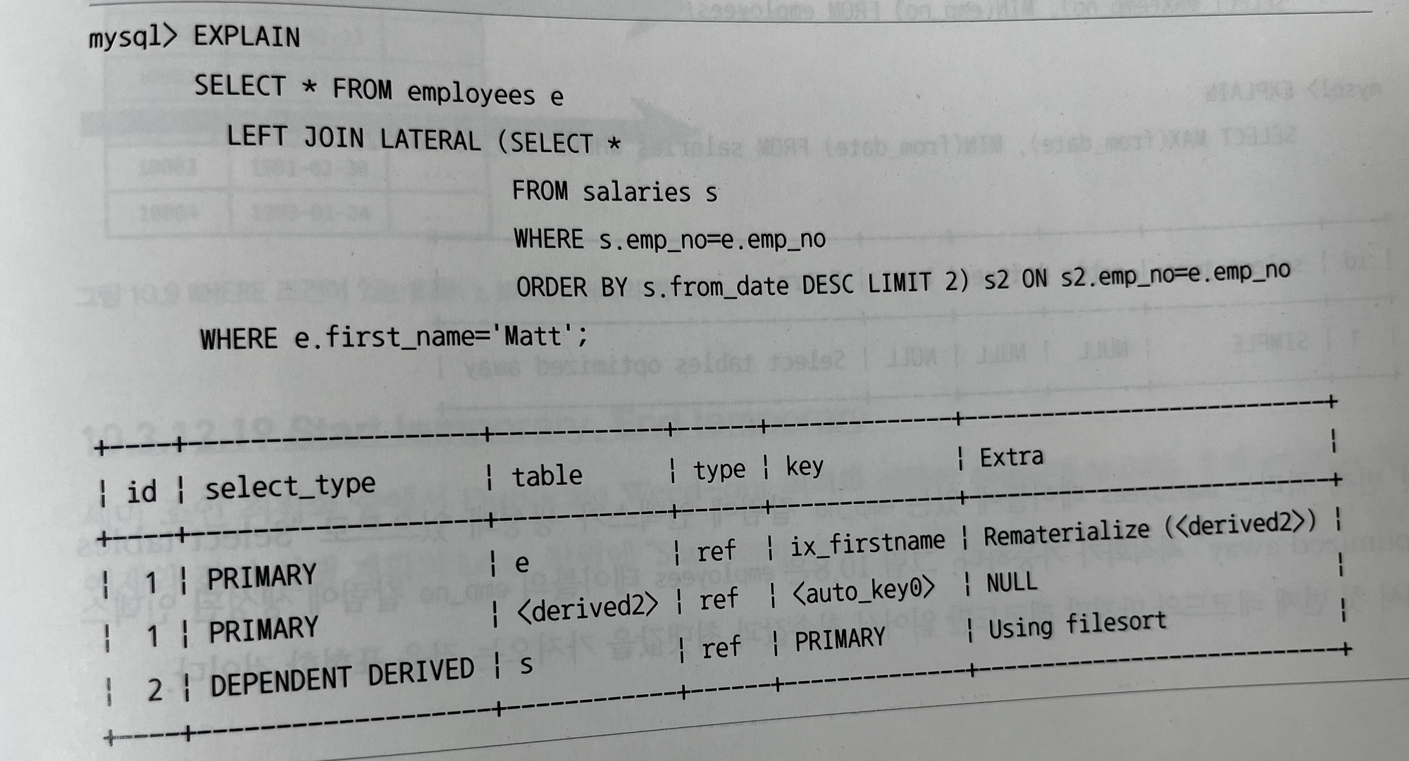 - 래터럴 조인으로 조인되는 테이블은 선행 테이블의 레코드별로 서브쿼리를 실행해서 그 결과를 임시 테이블에 저장한다. (Rematerializing)