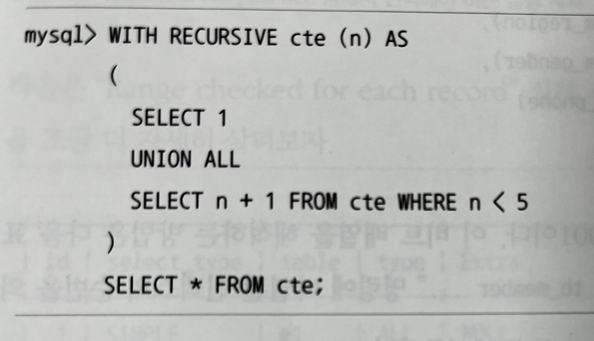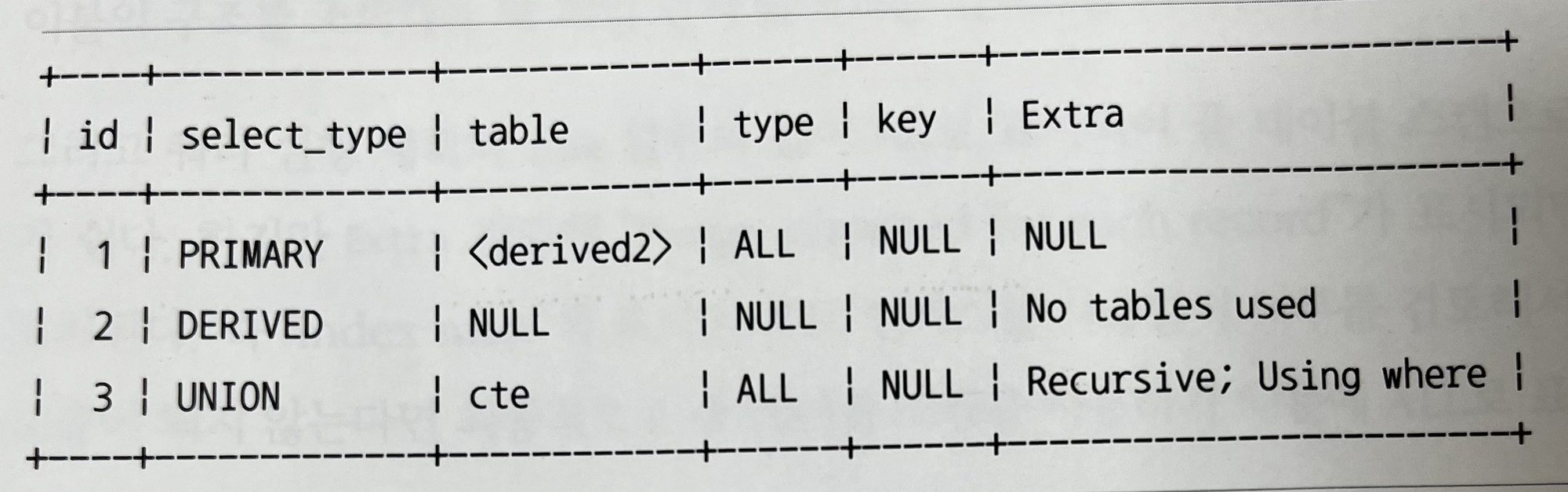 - UNION으로 결합하는 단위 SELECT 쿼리 가운데 첫 번째를 제외한 두 번째 이후 단위 SELECT 쿼리는 UNION으로 표시된다.