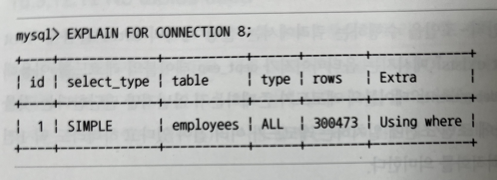- 다른 커넥션에서 실행 중인 쿼리의 실행 계획을 살펴볼 때 쿼리의 실행 계획을 수립하지 못한 상태에서 조회 시에 위와 같이 표시된다.
