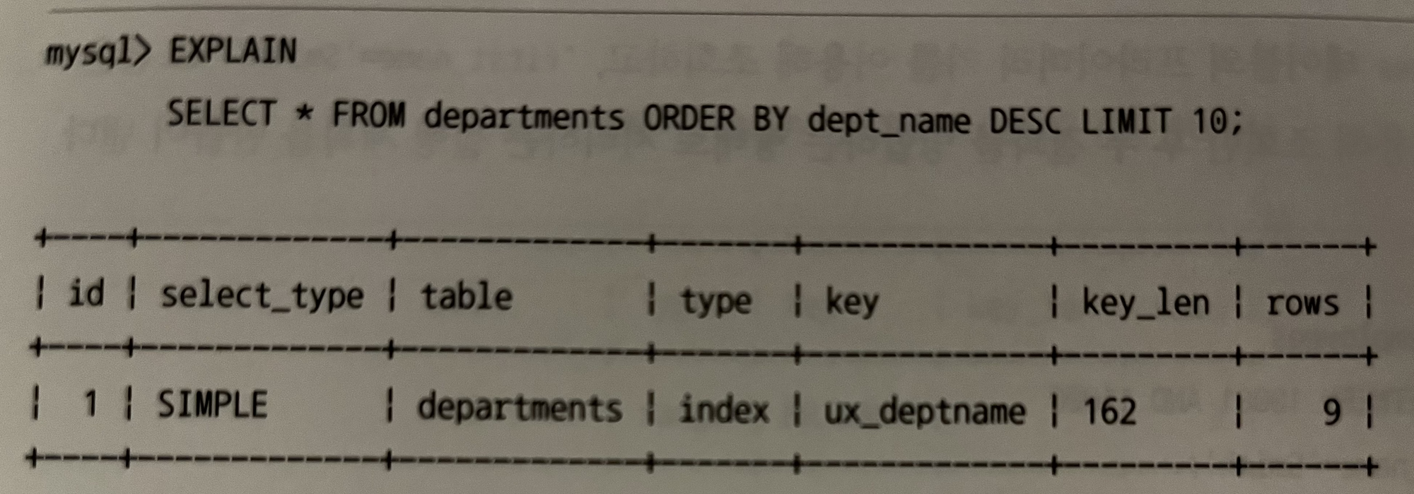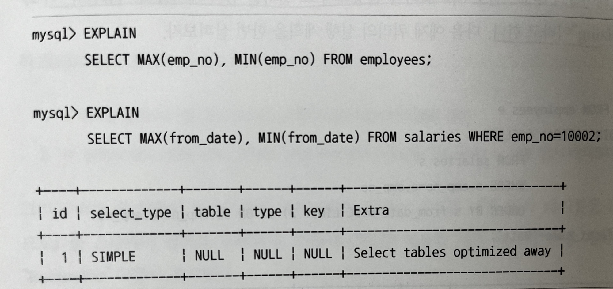 - MIN() 또는 MAX() 만 SELECT 절에 사용되거나 GROUP BY로 MIN(), MAX()를 조회하는 쿼리가 인덱스를 오름차순 또는 내림차순으로 1건만 읽는 최적화가 적용될 때