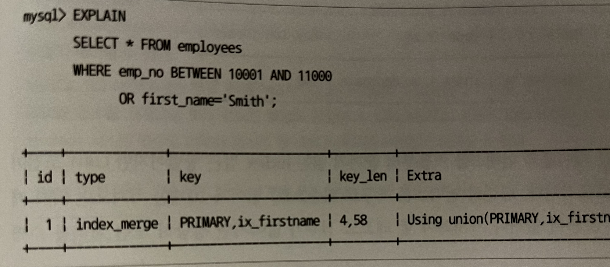 - index_merge 접근 방법으로 실행되는 경우 두 개의 인덱스를 어떻게 병합했는지를 표시한다.