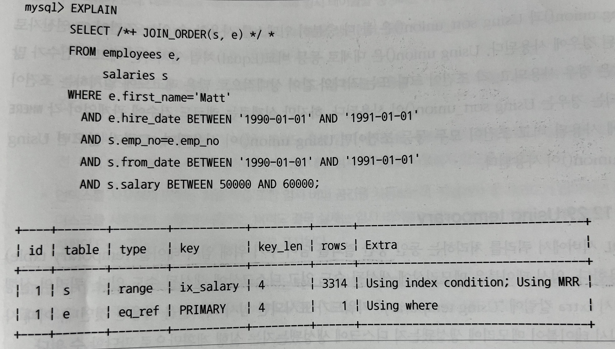 - 위의 실행 계획은 salaries 테이블에서 읽은 레코드를 이용해 employees 테이블 검색을 위한 조인 키 값들을 모아서 MRR 엔진으로 전달하고, MRR 엔진은 키 값을 정렬해서 employees 테이블을 최적화된 방법으로 접근한다.