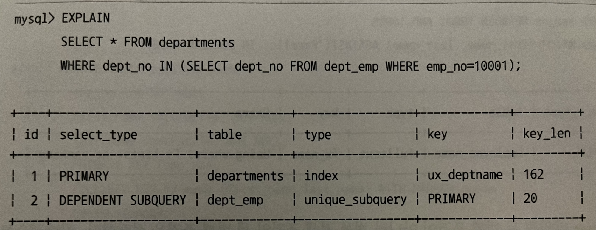- 서브쿼리가 바깥쪽(OUTER) SELECT 쿼리에서 정의된 칼럼을 사용하는 경우 안쪽(Inner) 서브쿼리 결과가 바깥쪽에 의존적이기 때문에 DEPENDENT가 붙는다.