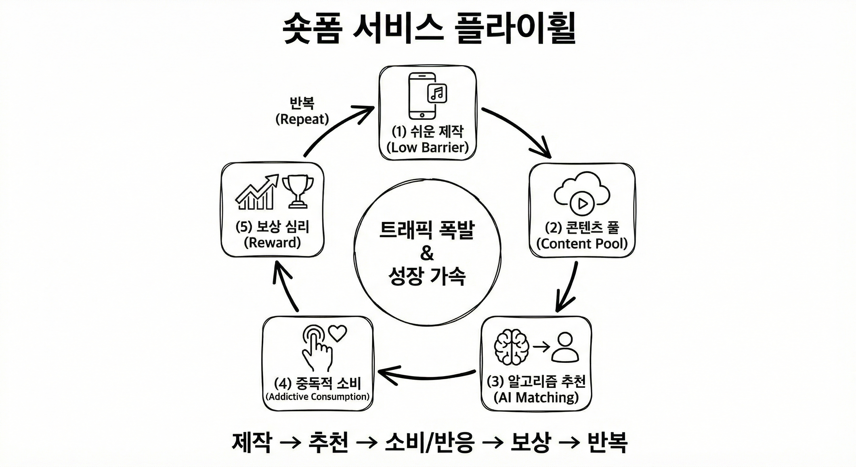 숏폼의 플라이휠을 봤을 때, 추천이 잘 되어서 유저의 소비까지 이루어지게 하려면 일단 영상 수급부터 채워야 한다고 생각했다. 영상이 많아야 시청자에게 더 다양한 콘텐츠를 보여줄 수 있고, 시청이 늘어나면 창작자에게 보상을 줄 수 있고, 보상이 있으면 다시 영상을 올리게 된다. 이 플라이휠을 만드는 것이 목표였다.