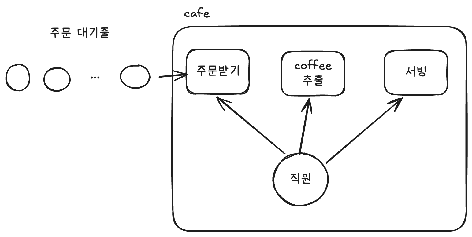 카페를 예로 들어보자. 한 명의 직원이 주문, 커피 추출, 서빙을 모두 순서대로 처리한다고 하자.