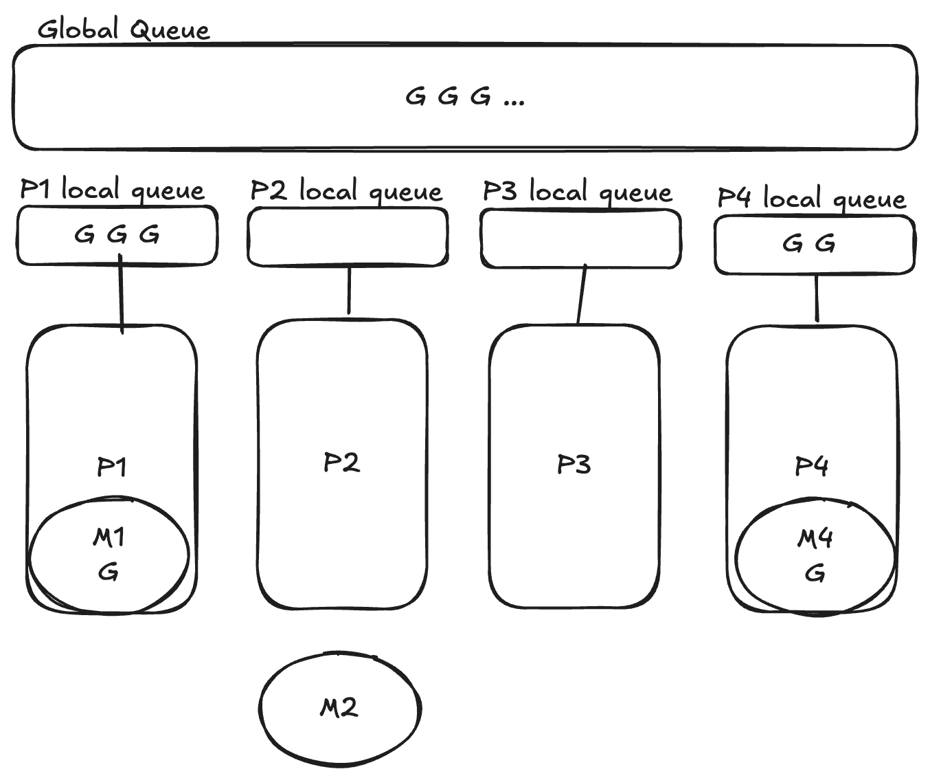 - M은 P에 현재 작업 중인 다른 M이 없는지 확인하고, 없으면 P의 로컬 큐에 있는 G를 수행하며 P를 점유한다.