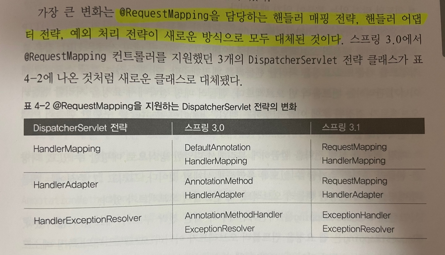 - 그렇기에 스프링 3.0에서는 DefaultAnnotationHandlerMapping 전략에선 매핑결과가 오브젝트가 될 수밖에 없고 AnnotationMethodHandlerAdapter가 실행할 메소드를 찾는 매핑 작업을 추가로 해야했다. 핸들러 어댑터에게 주어진 역할이 아닌 매핑 역할을 부분적으로 갖고 있는 이상한 구조가 될 수밖에 없었다.