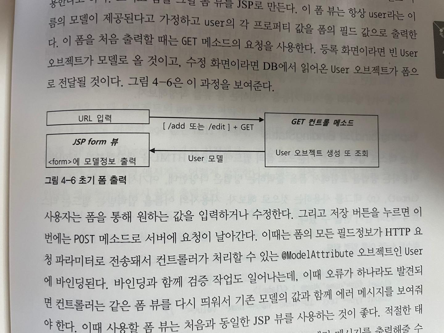 - 등록 화면이라면 빈 USER 오브젝트가 모델로 올 것이고, 수정 화면이라면 DB에서 읽어온 USER 오브젝트가 폼으로 전달될것이다.
