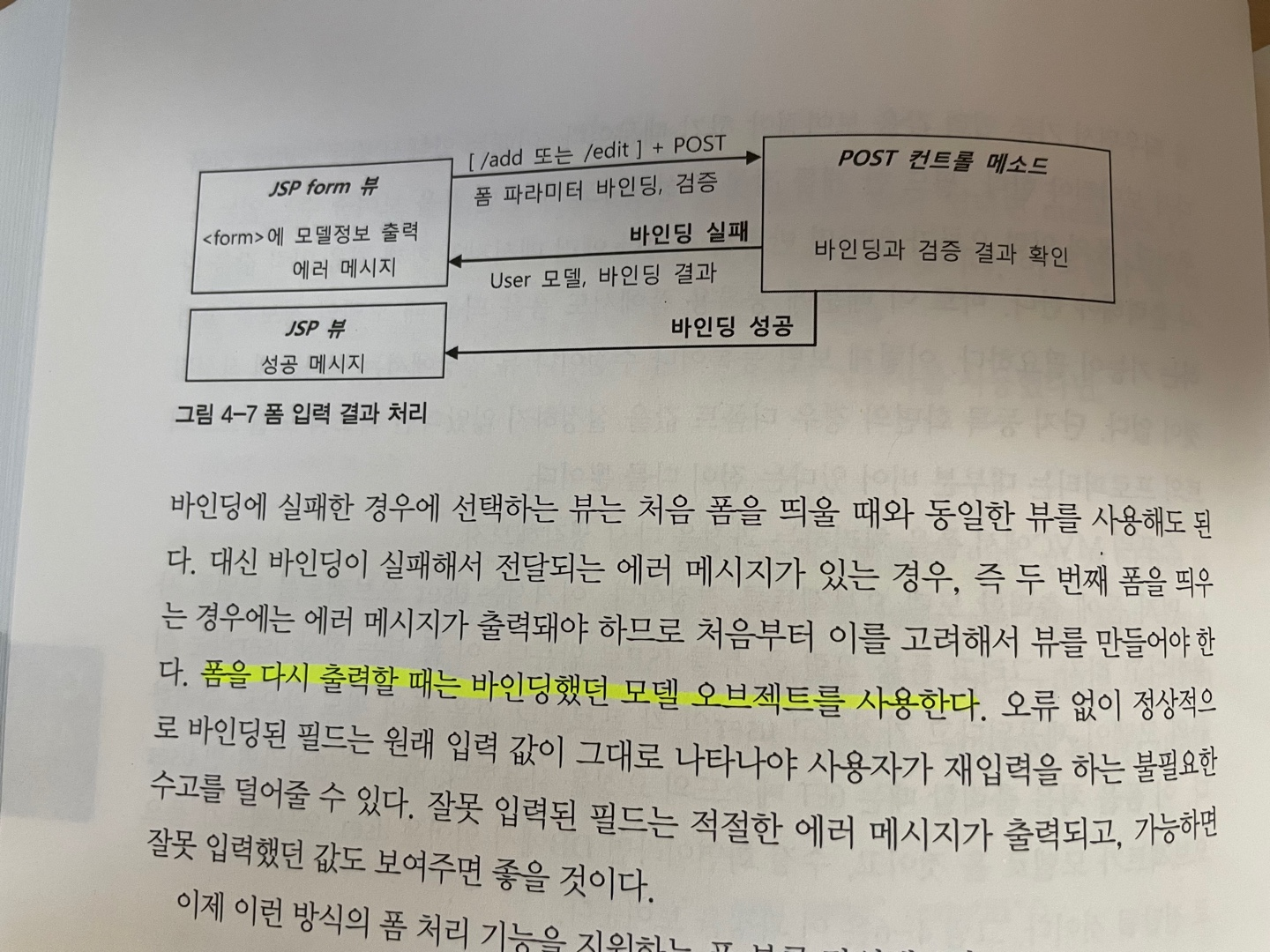 - 이때 바인딩과 함께 검증 작업도 일어나는데, 오류가 하나라도 발견되면 컨트롤러는 같은 폼 뷰를 다시 띄워서 기존 모델의 값과 함께 에러 메시지를 보여줘야 한다. (처음과 동일한 JSP 뷰)