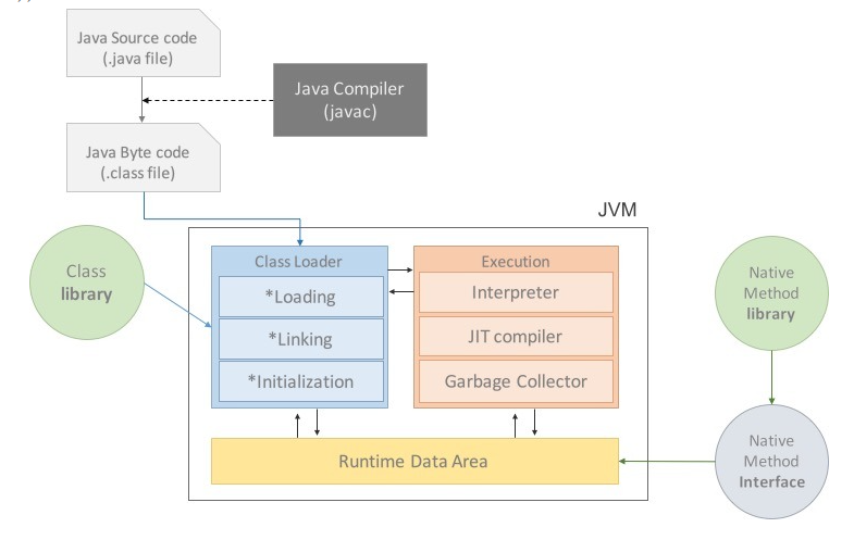 - JVM은 Java compiler를 통해 만들어진 Java Bytes Code(.class 파일)를 해석하고 실행하는 역할을 한다.